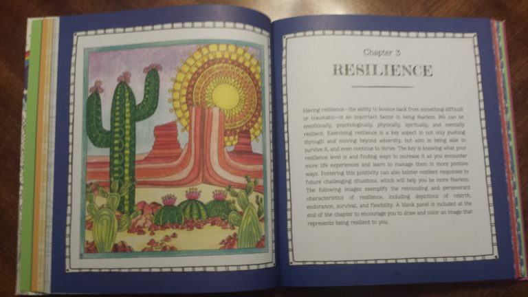 But this time, he got me something different – an adult coloring book. It’s titled Color Me Fearless and is split into seven themed sections: Courage, Strength, Resilience, Confidence, Power, Adventure and Freedom. This desert scene with cacti represents resilience. Very fitting, wouldn’t you say?