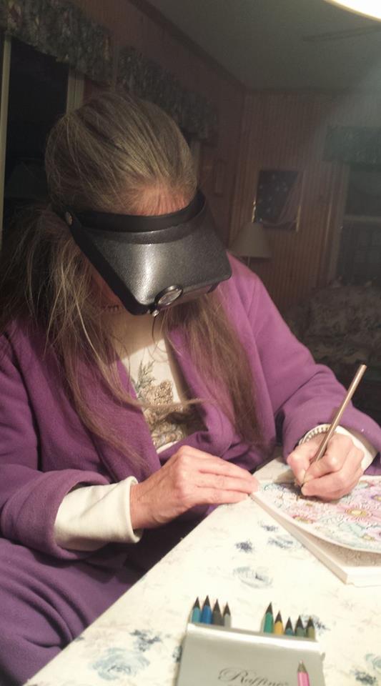 My sister, the ingenious person that she is, figured out a way around those obstacles – jeweler’s lenses. That’s what I call someone who is serious about her coloring!