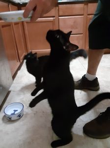When we meow, usually it means we want something, like food or attention. When Mommy is getting ready to feed us, Ziggy meows all while she’s cleaning our dishes, opening the can of kitty food and putting it in the bowls. I wait quietly. I’m more patient than Ziggy is. I know Mommy’s going to put the food down, and it doesn’t get there any faster, no matter how much Ziggy hollers. Although if Mommy or Daddy are too slow, I stand up for it.