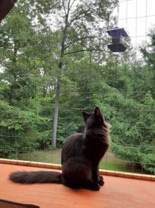 Ziggy here. Zorro and I have lots of places we like to hang out. One of our favorites is the “catio” Mommy and Aunt Kim made for us in North Carolina. We have lots of fun sitting on the bar and watching the birds come to the feeder. They’re almost close enough to reach out and grab (but not quite).