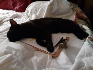 Mommy says some of our hangouts are a little strange, like when Mommy took some work to bed with her, and instead of lying on the soft bed, Zorro went to sleep on her clipboard.