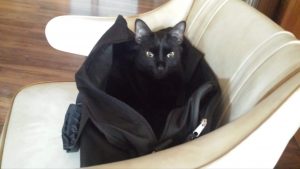 We both love boxes and bags. Here, Zorro thinks he’s camouflaged—black cat in a black bag. But I can see him.