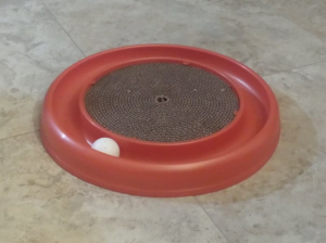 But one of my favorite toys is this. When I hit the ball, it goes ‘round and ‘round. What’s even cooler, though, is the cardboard stuff in the middle. It feels so good on my feet. I sharpen my claws on it, and Mommy doesn’t yell at me like she does when I tear up the furniture or the woodwork.